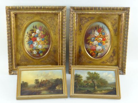 TWO PAIRS OF SMALL DECORATIVE PAINTINGS, comprising two landscapes with cottages indistinctly signed, 11.5 x 17cms, and a pair of Continental oval flowers studies signed Van Holt, 17cms high (4)