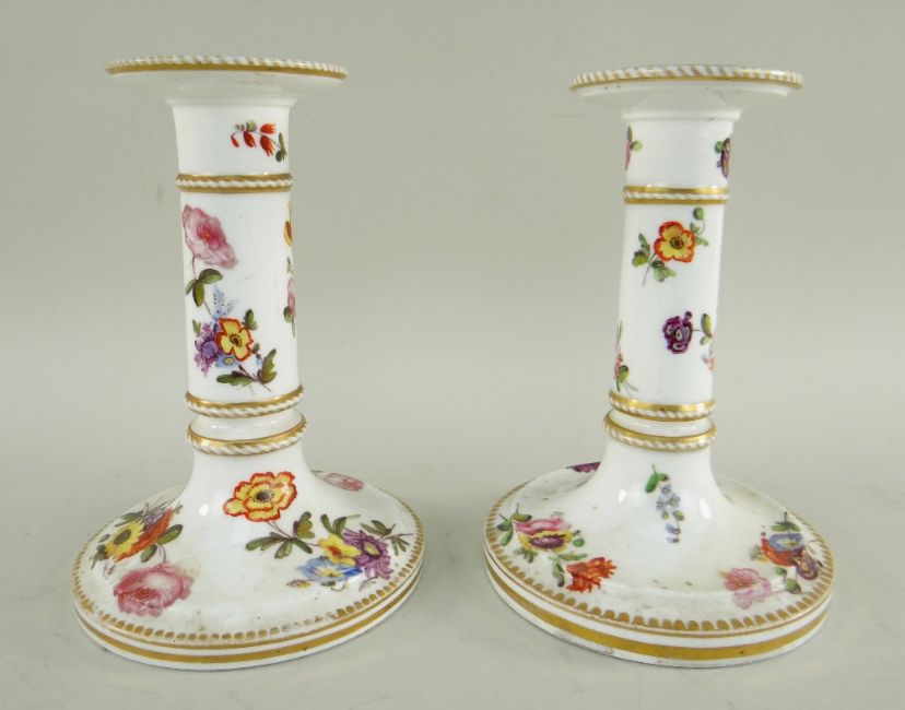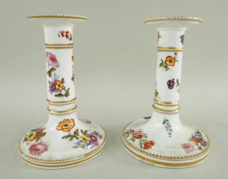 PAIR 19TH CENTURY STAFFORDSHIRE PORCELAIN TABLE CANDLESTICKS, painted with sprays of summer flowers in bright enamels between gilt borders, 15.5cms high (2)