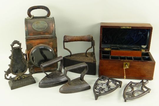 ASSORTED METALWARE & MAHOGANY APOTHECARY BOX including Shand Mason & Co copper lantern, three iron flat irons and 2 stands, frame, and 19th Century mahogany apothecaries box (9)