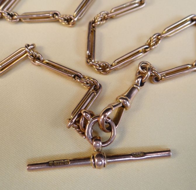 9CT GOLD TROMBONE LINK WATCH CHAIN, with T-bar, 37.5cms long, 23.8gms