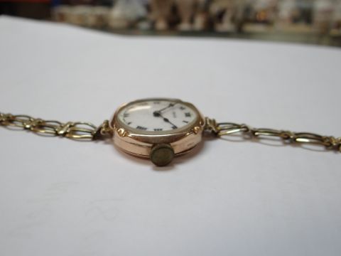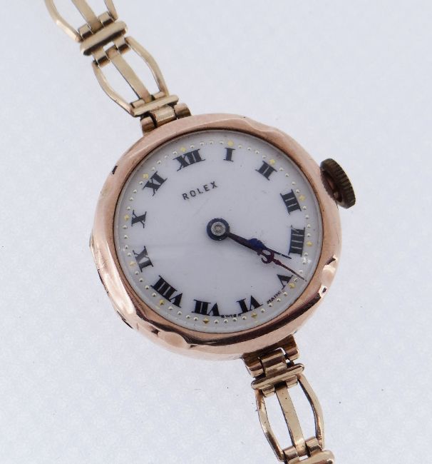 9CT GOLD ROLEX WRISTWATCH, having engraved initials to back cover, engraved presentation engraving to inside back cover, Rolex '15 Jewels' movement, with rolled gold braceletIt does look like the watch works. It winds well, the hands move well. It is ticking when moved. I am unsure whether it keeps time.There are light surface scratches, no damage, the winder is slightly discoloured.The strap looks good, both springs have tension, the clasp looks good and works well.The length of the bracelet when layed flat is 16cm’s, there are two springs one on each side of the watch face which when stretched add another 2cm’s the length.