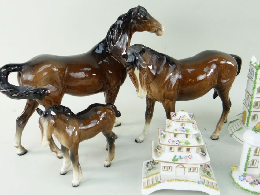 SEVEN MODERN COALPORT BONE CHINA COTTAGES & BESWICK HORSES including 'village church', 'coaching inn', 'dove cote', 'toll house', 'pagoda house', 'keepers cottage' and 'twin towers', together with three Beswick horses (11)