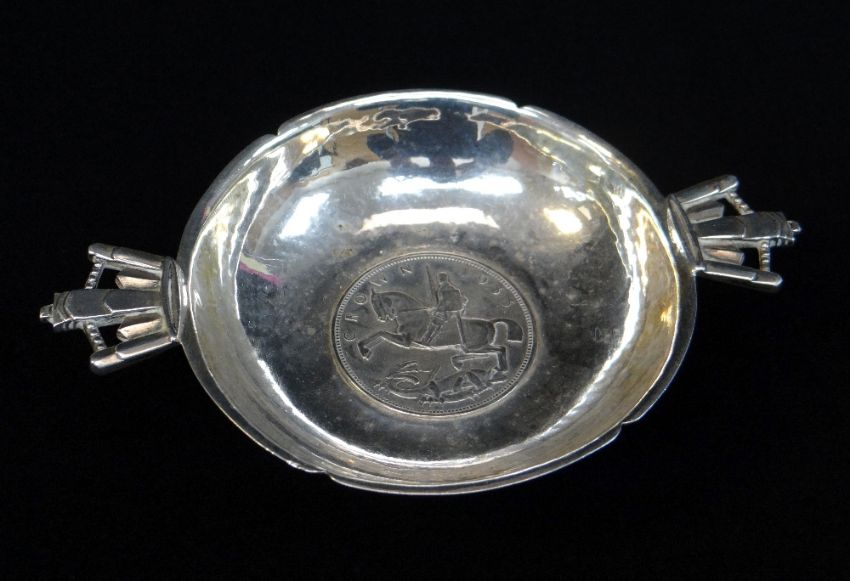 ARTS & CRAFTS SILVER TWO-HANDLED DISH, London 1935 by Robert Edgar Stone, planished lobed circular bowl with crown handles, base inset with 1935 crown, handles with engraved initials and date verso, 13.5cms diam., approx. wt. 3ozt