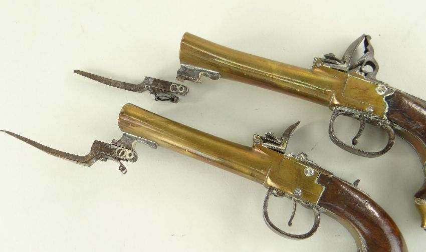 Condition: both worn, one with broken bayonet hinge and broken point, other bayonet bent, one with broken cock, one missing cock top and screw.