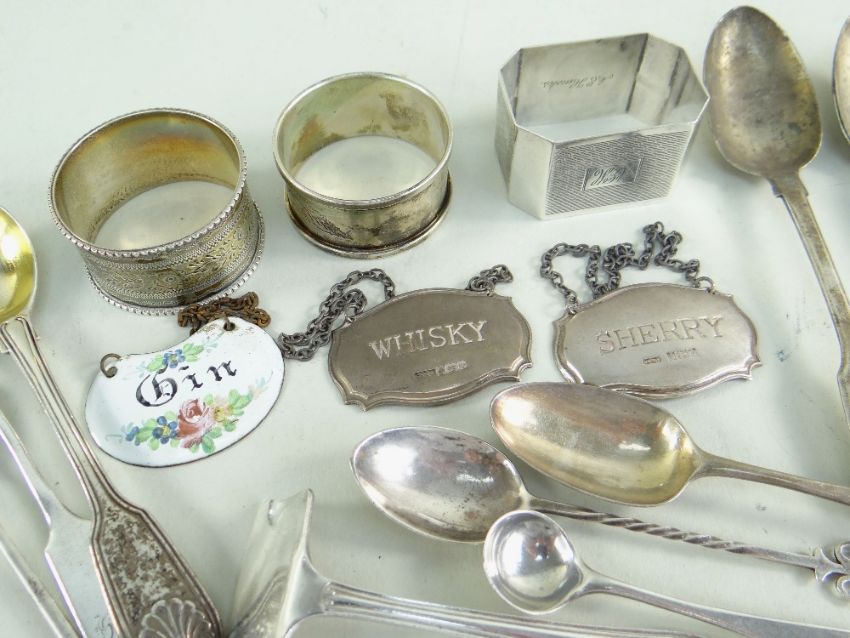 ASSORTED SILVER comprising three silver napkin rings, 'Whisky' and 'Sherry' silver decanter labels and a enamel 'Gin' decanter label, silver baby pusher and various silver spoons including teaspoons, mustard spoons ETC