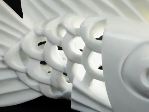 DARREN YEADON carrara marble sculpture - fish with openwork lattice carving, 38cms high Provenance: consigned by artist via our Cardiff office Presentation & Condition: no problems, unmountedPlease note that this lot may be subject to Droite de Suite at 4% of the hammer price (Please see terms / enquire)