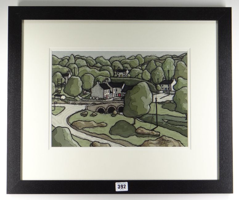 ALAN WILLIAMS acrylic - road bridge and cottages, entitled verso 'Little Mill, Dyfed', signed, 25 x 35cms