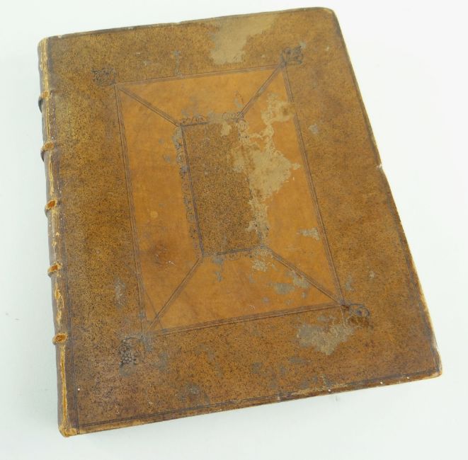 Condition Report: all plates appear to be present, holes to leaves which are larger near end leaves, some insect damage scattered throughout, mainly marginal,early page shows a tear and missing piece, some stained page margins, covers with worn patches, otherwise pretty fair.