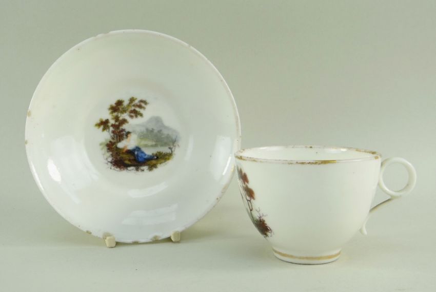 A SWANSEA GLASSY PORCELAIN CUP & SAUCER BY WILLIAM BILLINGSLEY the saucer painted with a scene of figure relaxing in landscape, the cup with similar figure walking in trees with basket, saucer 14cms diam