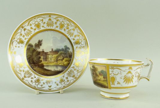 A SWANSEA PORCELAIN BREAKFAST CUP & SAUCER the cup of London shape with ogee handle, the cup painted with a landscape panel of bridge, two houses and mountains beyond, the saucer with a medieval great house, inscribed to the base Aldham Hall Essex, probably by George Beddows