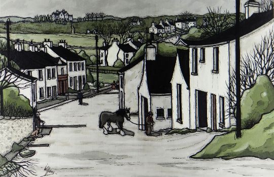 ALAN WILLIAMS acrylic - village street scene with figures and tethered pony, entitled verso 'Llanarth, Dyfed', signed, 34 x 50cms