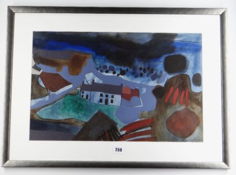 MARY LLOYD JONES mixed media - farmhouse and buildings, signed in full, dated '75, 34 x 53cms Provenance: private collection, consigned via our Cardiff office Presentation & Condition: no problems, framed and glazedPlease note that this lot may be subject to Droite de Suite at 4% of the hammer price (Please see terms / enquire)