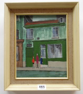 JACK JONES oil on board - three standing figures in a Parisian street, entitled verso '26 Rue Des Vinaigriess' on label for Attic Gallery Swansea, signed and dated 1982, 24 x 19cms Provenance: private collection Cornwall, purchased by vendor from the owners of Attic Gallery Presentation & Condition: no problems with painting, original framing may need attentionPlease note that this lot may be subject to Droite de Suite at 4% of the hammer price (Please see terms / enquire)