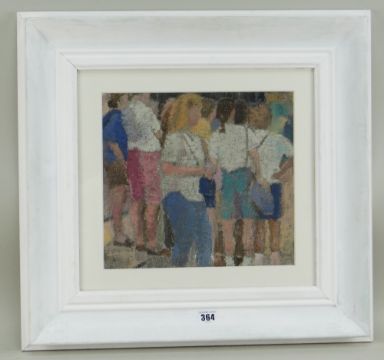GORDON STUART oil on board - group of watching figures, entitled verso 'Spectators', dated 2011, signed, 26 x 29cms