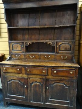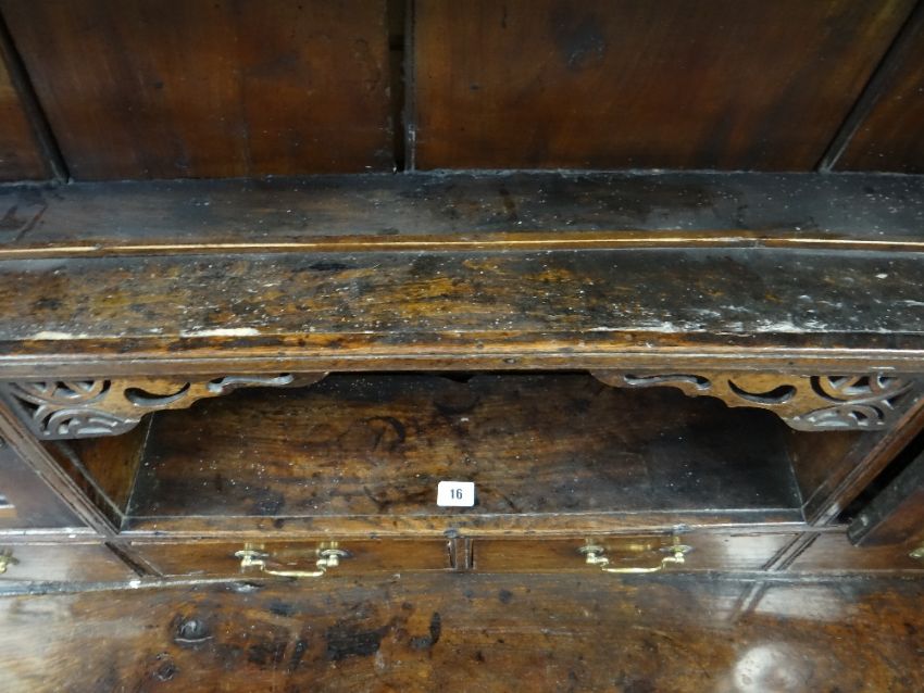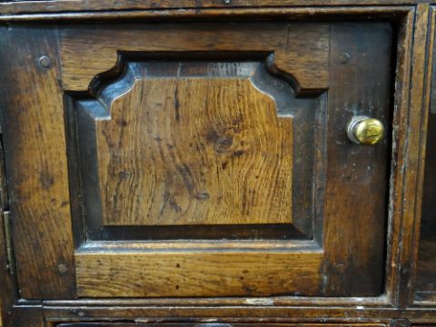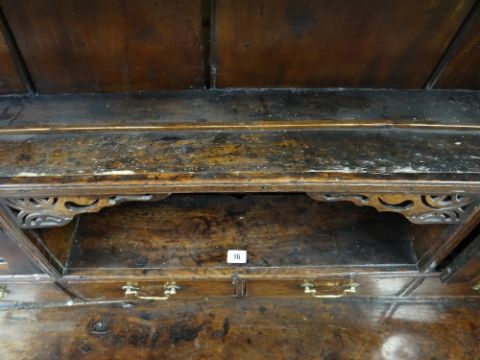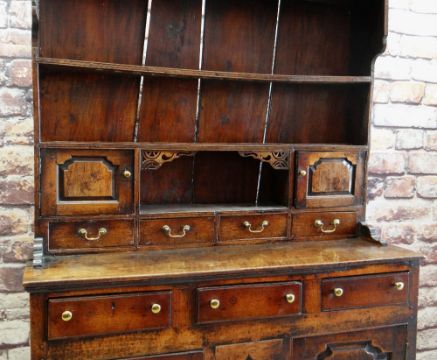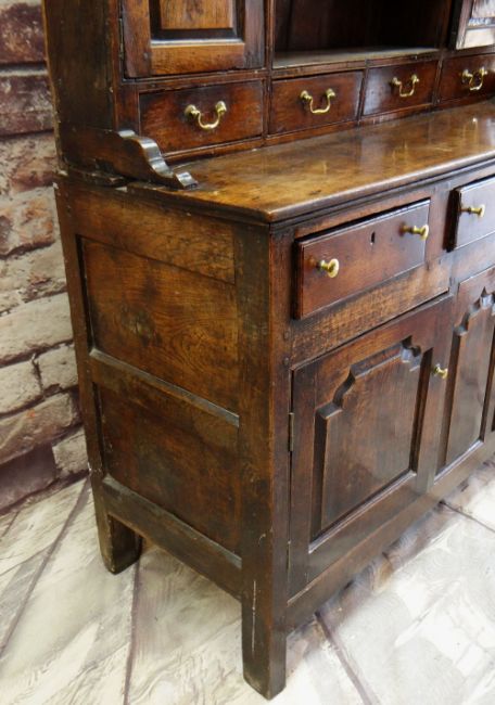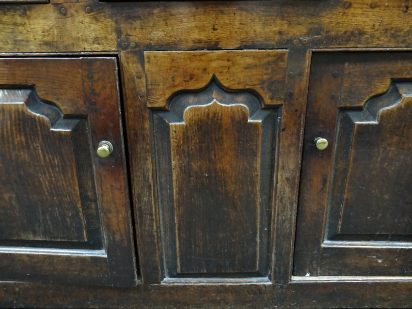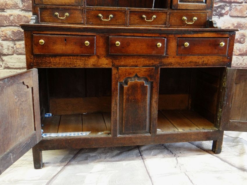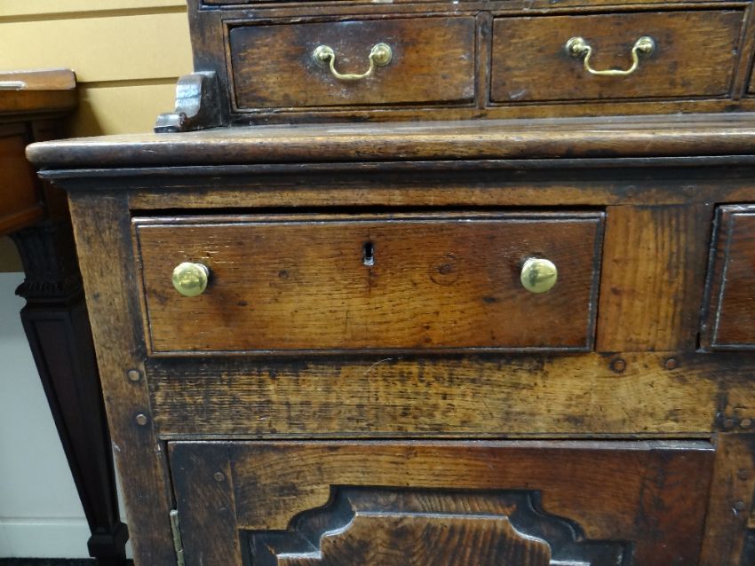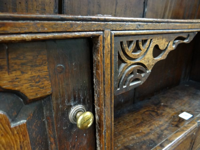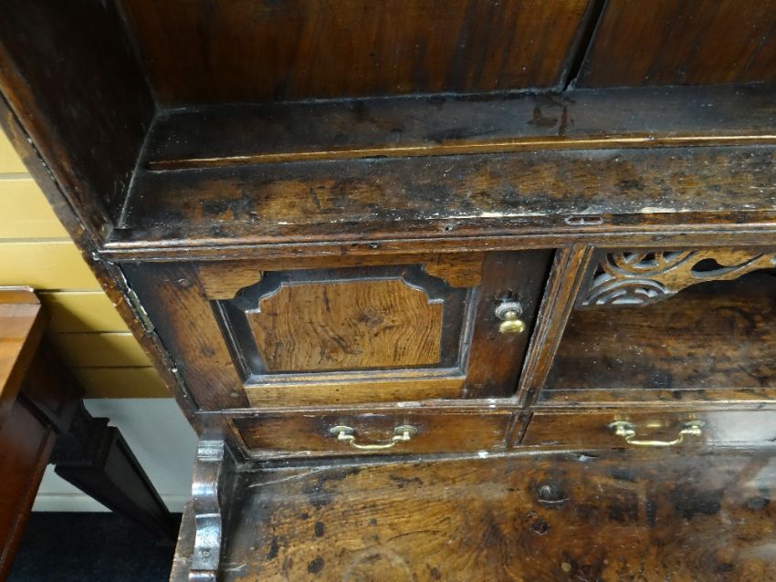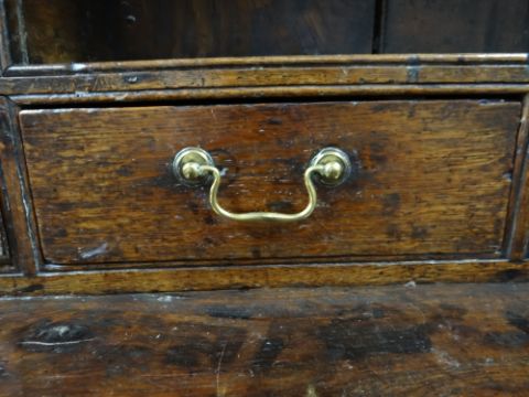 A SMALL CHARACTERFUL OAK NORTH WALES CUPBOARD-BASE WELSH DRESSER early to mid-18th Century, having a base of two panelled cupboards and three upper drawers on stile feet, the boarded rack with two shelves over flanking cupboards, centre cavity with unusual carved fretwork and four spice drawers with brass swan-neck handles, possibly Llyn Peninsula, Caernarfonshire, 199h x 135w x 51cms