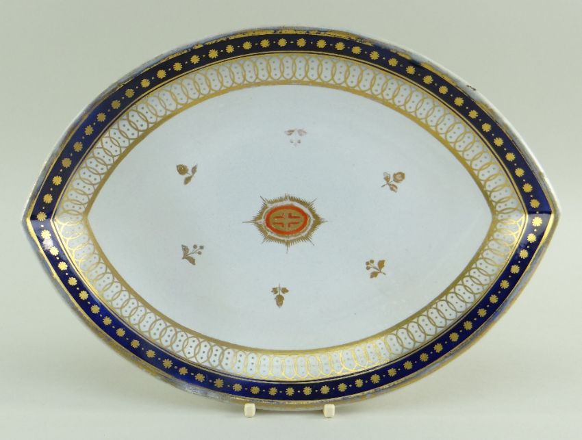 SWANSEA PEARLWARE COMPORT STAND FROM THE 'NELSON SERVICE' BY THOMAS PARDOE circa 1802, marquise shaped, border decorated in deep blue reserve with gilded florettes and with repeated gilt decoration, the interior with centred iron red and gilt Garter Star, impressed SWANSEA to base, 28cms