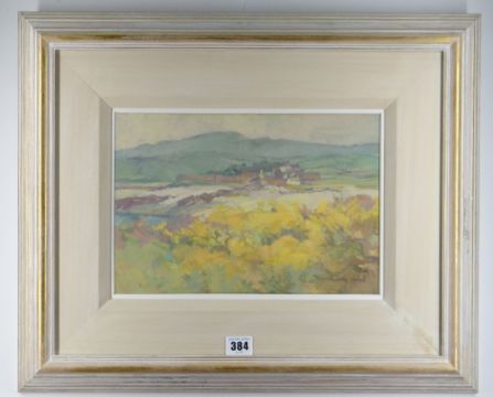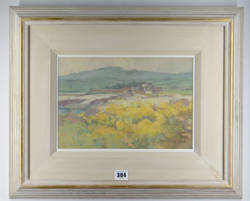 AUDREY HIND oil on board / card - Ynys Mon landscape with farm, entitled verso 'Cemlyn', signed, 21 x 30cms Provenance: private collection consigned via our Colwyn Bay office Presentation & Condition: excellent frame, glazed, no problemsPlease note that this lot may be subject to Droite de Suite at 4% of the hammer price (Please see terms / enquire)
