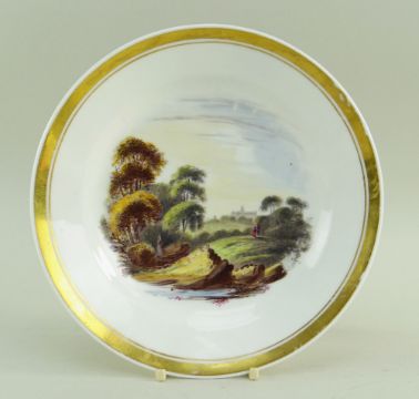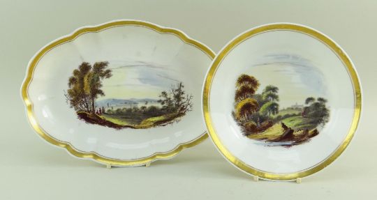 TWO SWANSEA PORCELAIN DISHES DECORATED IN LANDSCAPES BY GEORGE BEDDOWS comprising fluted oval dish, 29cms and circular dish, 20cms diam, both with gilded borders and interior landscapes, 'Nr Southampton' and 'St Albans Abbey, Herts', corresponding script titles in red to bases, SWANSEA impressed mark to circular and Swansea trident mark to oval