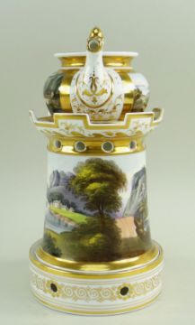 A WELSH LANDSCAPE ENGLISH PORCELAIN VEILLEUSE (tea-pot and warming stand) comprising miniature teapot over a tapered castle turret heating-stand and with circular base, gilded and decorated with views including Oystermouth Castle and Mumbles Head and Glenmire Bridge, Cork (titles to base of teapot) possibly painted by Philip Ballard at the London workshop of J Bradley & Co, circa 1820, 22cms high (assembled),