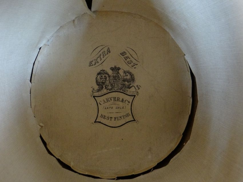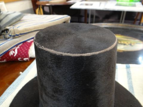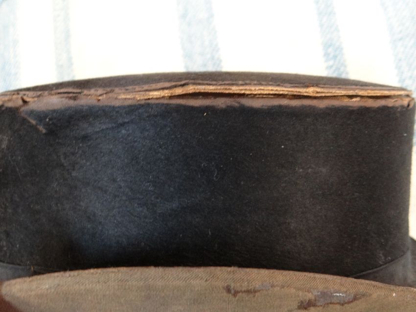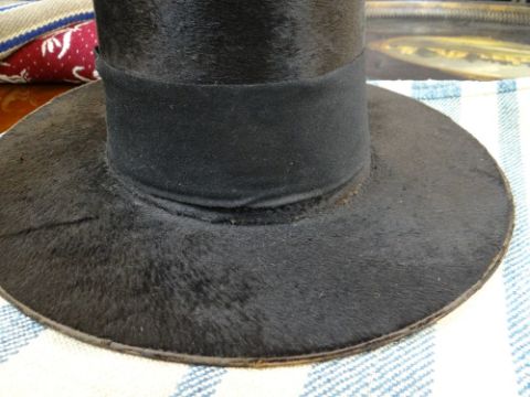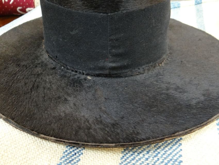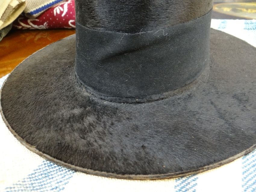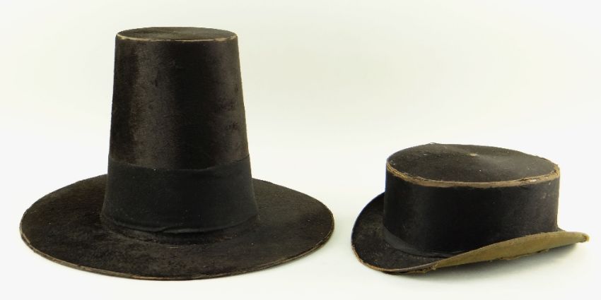 WELSH HIS & HER HATS the ladies in familiar traditional tall form with black fur, possibly mole, having a tapered chimney with wide ribbon and wide brim, interior lining printed for Carver and Co, 22cms high, the rarer gent's hat, shorter, bearing narrow ribbon and with narrow shaped brim, 26cms long Provenance: to accompany a facsimile of the original owners of the two hats, Thomas and Elinor Morgan, entered for auction by Mr Morgan of Warwickshire, to him by descent Condition Report: ladies in reasonable condition, some wear and marks but not significant, gent's is complete, top is coming away from base, tears to lining, no labelsThe ladies hat has a lot of edge wear, no holes, rips or tears just wear along most edges.The gentleman’s hat has far more wear. The top has also split.