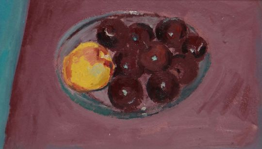 GORDON STUART oil on board - still life of fruit in a bowl, 24 x 42cms