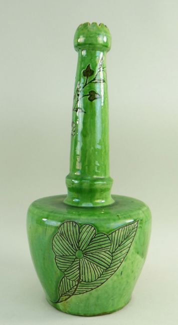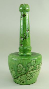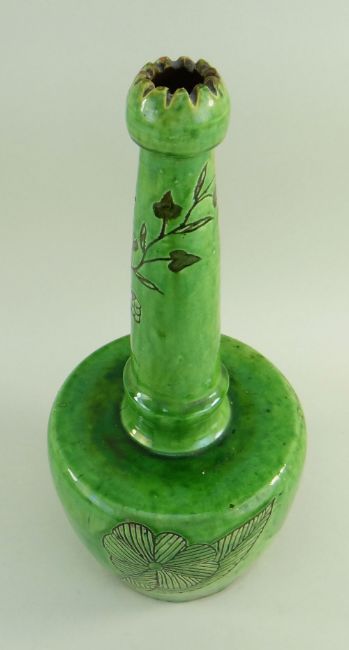 A EWENNY SLIPWARE POTTERY BOTTLE VASE BY EVAN JONES having a serrated knopped neck, green glaze with sgraffito decoration of branches of leaves to the body and hops to the neck, inscribed Jones to base, circa 1900, 35cms high