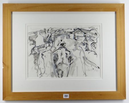 WILL ROBERTS mixed media with ink and watercolour wash - standing farmer and farm buildings, signed with initials, dated '97, 29 x 40cms Provenance: private collection Kent Presentation & Condition: image has moved slightly in mount, revealing sketch pad perforations, framed and glazedPlease note that this lot may be subject to Droite de Suite at 4% of the hammer price (Please see terms / enquire)