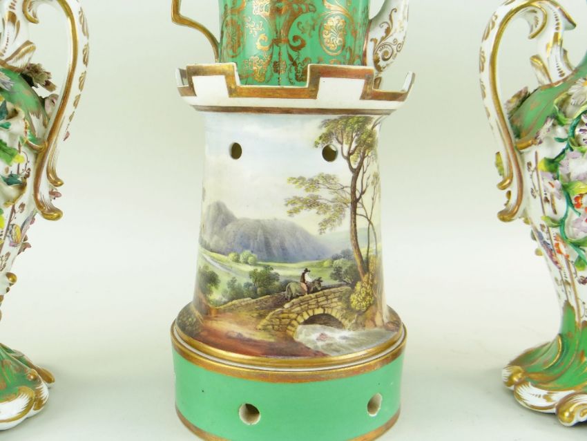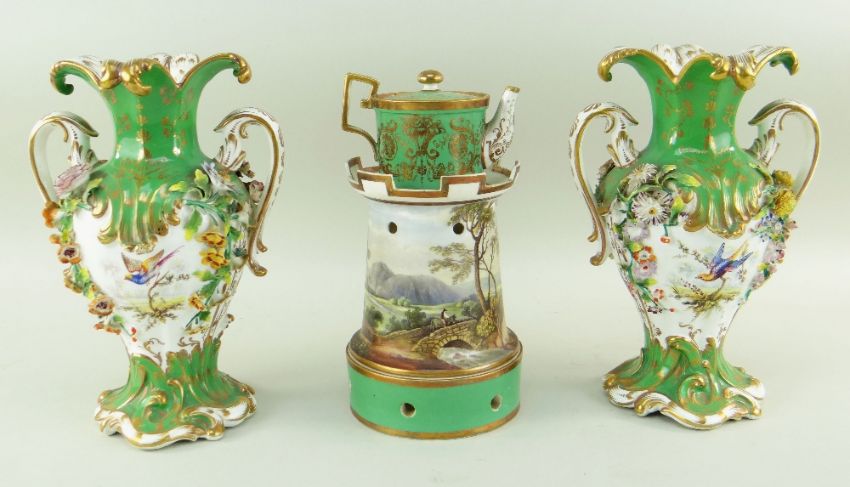 Condition: vases - one with restuck rim and hairline crack to one handle, both with chips to the encrusted flowers; teapot - regilded chip to spout.