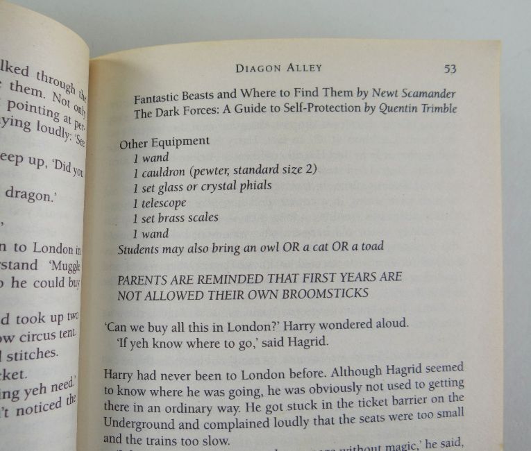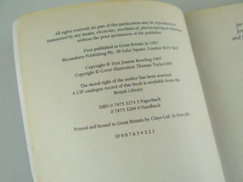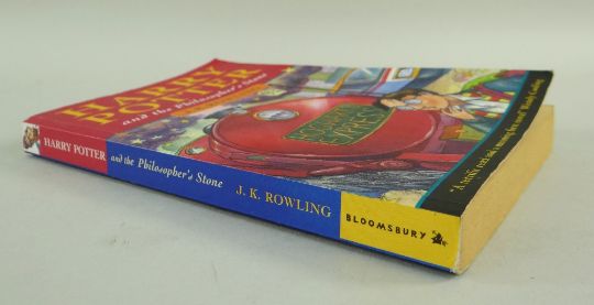 ROWLING (J. K.) Harry Potter and the Philosopher's Stone, first edition, first issue, London Bloomsbury, 1997, paperback, print line on copyright page reads '10 9 8 7 6 5 4 3 2 1', '1 wand' appears twice on p.53, 'Philosopher's' is misspelled 'Philospher's' to rear cover, 'Wizardry and Witchcraft' to rear cover, rather than 'Witchcraft and Wizardry'
