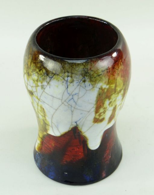 ROYAL DOULTON 'CHANG' VASE by Charles Noke, Harry Nixon and Fred Allen, of slightly waisted shape having thick layers of craquelure glaze, marked and signed to base, 18cms high