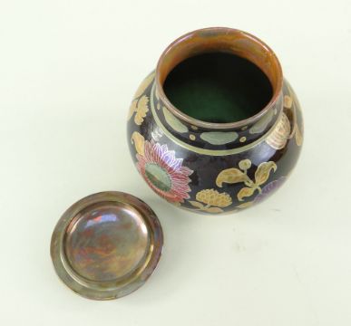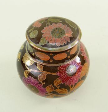 ZSOLNAY PECS FLAMBE LUSTRE JAR & COVER, c. 1924-1970, painted with sunflowers in puce and orange on a chocolate ground, red flambe base with printed and impressed marks, 10.5cms high