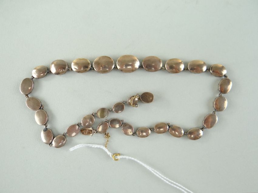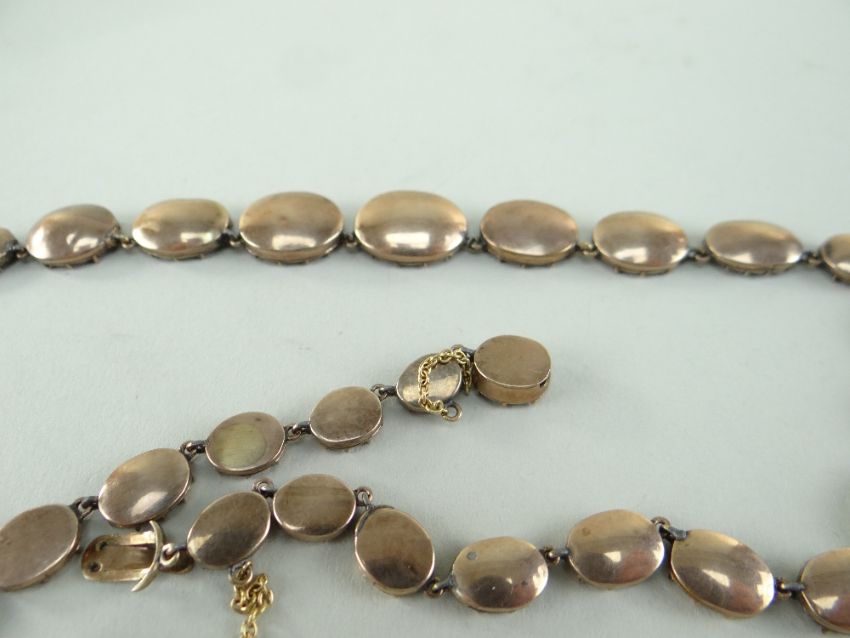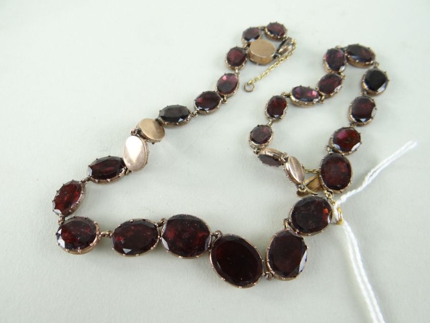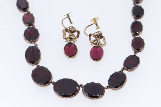 GARNET SET RIVIERE NECKLACE, the thirty graduated oval-shaped stones closed set in yellow metal, 38.5cms long, together with similar bow design 9ct gold earrings, 29.3gms overall Provenance: private collection Cheshire, consigned via our Colwyn Bay office Condition: no visible hallmarks on necklace, all stones are very included and variable in colour, one or two stones chipped, clasp in working order, in black jewellery box, yellow metal untestedThe largest garnet size is 15x11mm