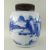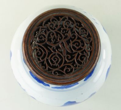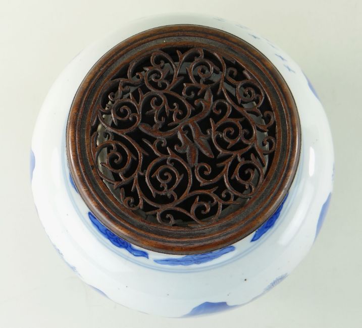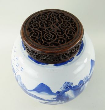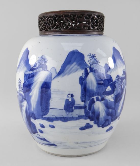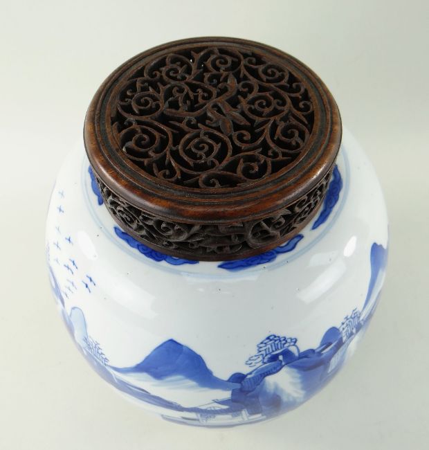 CHINESE BLUE & WHITE PORCELAIN 'SCHOLARS AND LANDSCAPE' JAR, Kangxi, of ovoid form, painted with a broad continuous frieze depicting two figures in an extensive mountainous landscape with river and pavilions, cloud collar to the shoulder, base with double circle, later pierced hardwood cover, 22cms high, 25cms with cover