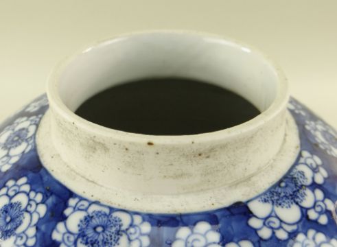 CHINESE BLUE & WHITE PORCELAIN 'HAWTHORN' JAR AND COVER, late Qing Dynasty or later, painted with two lobed panels of vases of lotus and of peony and with Chinese antiques, reserved on a cracked ice and flowerhead ground, 25.5cms high