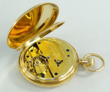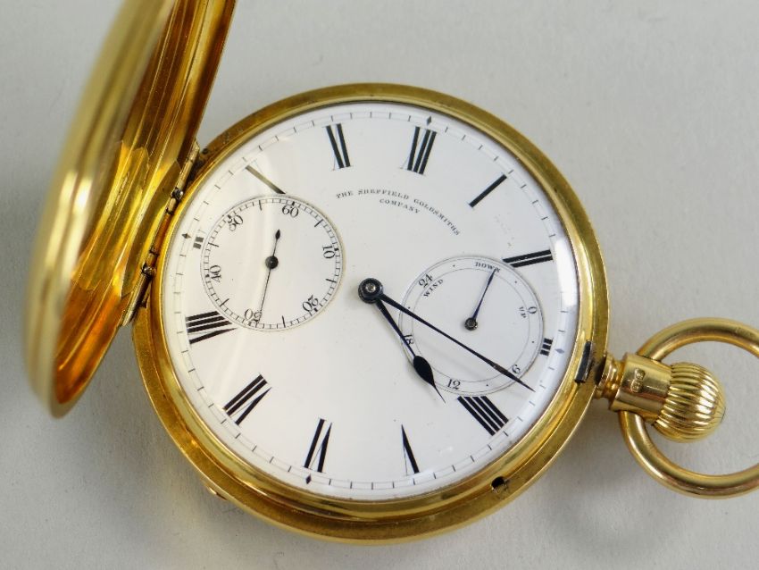 FINE SHEFFIELD GOLDSMITHS COMPANY VICTORIAN 18CT GOLD FULL HUNTER POCKET WATCH WITH POWER RESERVE, by VICTOR KULLBERG, numbered 4746, London hallmark for 1885, frosted gilt 3/4 plate movement with helical steel balance spring, cut and compensated balance, white enamel dial with black Roman numerals and outer five minute divisions, subsidiary seconds and up-down dials, blued steel spade hands, polished round hinged case with monogrammed front and back, EW case maker's mark possibly for Ebenezer White, dial and movement signed, 50mm Provenance: private collection south Wales, consigned via our Cardiff officeAuctioneers Note: No. 4746 is specifically reffered to in the hand-written entry in the Day Book of Victor Kullberg, where the Sheffield Goldsmiths Company returned the watch insisting the name of the firm be printed on the dail and engraved on the plate, presumeably instead of Victor Kullberg. Victor Kullberg is recorded as making some of the finest chronometers and he was one of the most successful horologists of the 19th century. He was born in Visby, Sweden in 1824 and worked for LU Jurgensen in Copenhagen, moving to London in 1851. He gained many top medal awards around the world, including nine gold medals with diplomas of honour. Kullberg came top of the Greenwich trials twelve times and was granted the Cross of the Legion of Honour in 1889. He died in 1890. With thanks to Mr Jon Campbell for help in attributing this fine watch.Condition: very minor wear to case, dial with small hairline at 7, minute hand slightly corroded, otherwise super, winds & runs, gross wt. 139.6g
