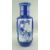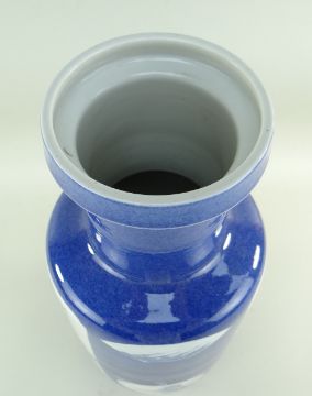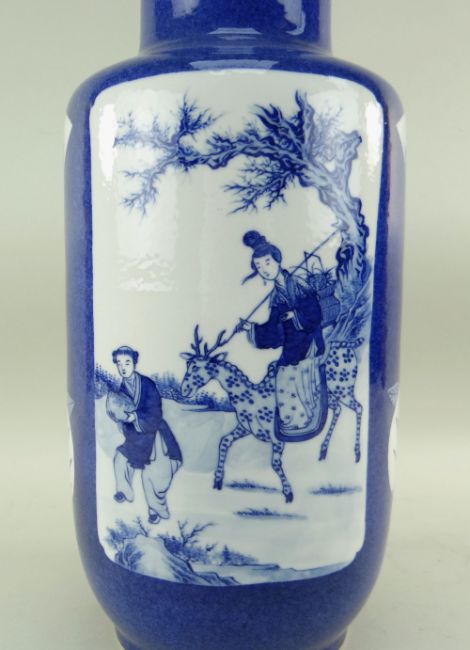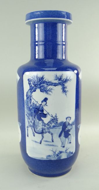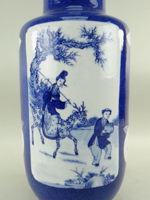 CHINESE POWDER BLUE GROUND PORCELAIN ROULEAU VASE, six-character Kangxi mark but 19th/20th Century, painted with two large reserves depicting Xiwangmu with flower basket and hoe, riding a deer beside an attendant holding a large peach of immortality, beneath a gnarled pine tree, four other smaller fan-shaped and pomegranate-shaped reserves painted with fish and with flowering iris respectively, base with apocryphal reign mark within a double circle, 43cms high