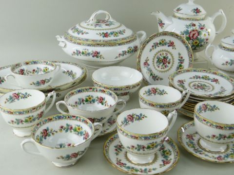 EXTENSIVE COALPORT 'MING ROSE' BONE CHINA MATCHED TEA & DINNER WARES, including teapot, sucrier, slops bowl, two vegetable tureens, two oval serving dishes, large and small sauce boats & stands, six soup bowls & stands, six teacups and saucers, preserve pot, graduated set of gratin dishes, twelve dinner plates, six dessert plates, several other saucers/small plates (approx 80)