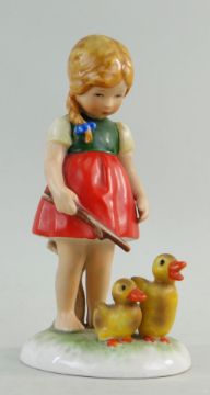 RARE GOEBEL KATHE KRUSE PORCELAIN GIRL WITH DUCKINGS FIGURE, signed in the clay, printed marks and dated 1955, 15cms high