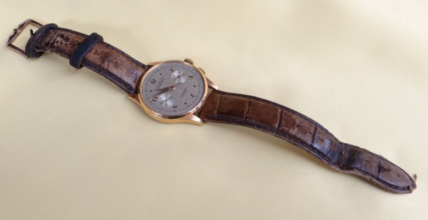 Condition: gilt metal snap on back worn, movement not running, chrono hand bent, seconds hand missing, all hands tarnished, dial moderately spotted and blistered around perimeter, lacks perspex dial cover, plated pushers & crown worn, bezel with dint at 2, in need of overall restoration.