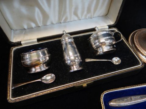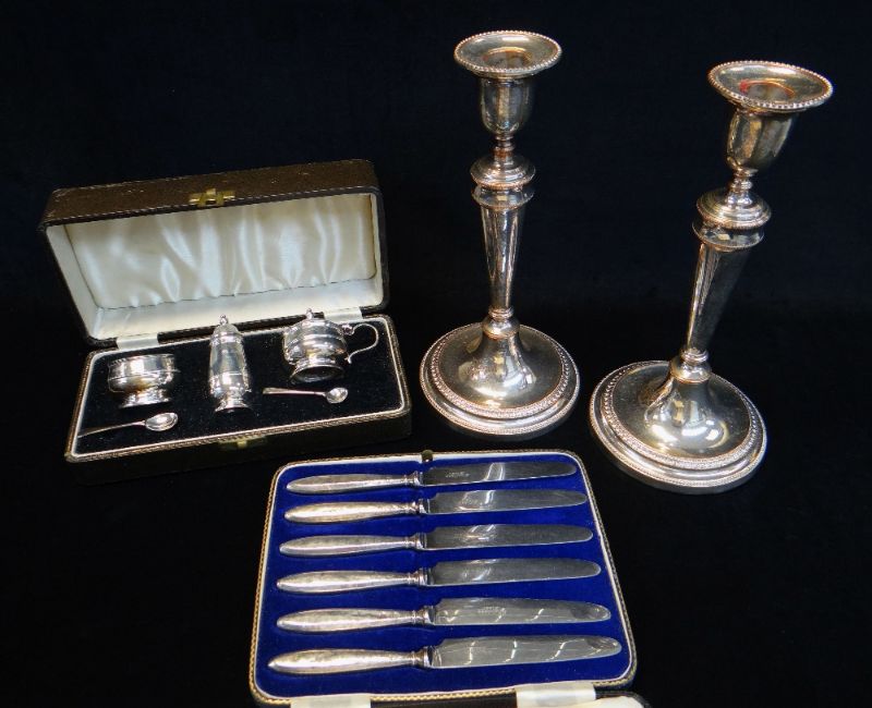 Condition: Fruit knife handles worn and dinted, hallmarks very worn, cruet good condition overall, candlesticks plating worn exposing copper to high points and seams