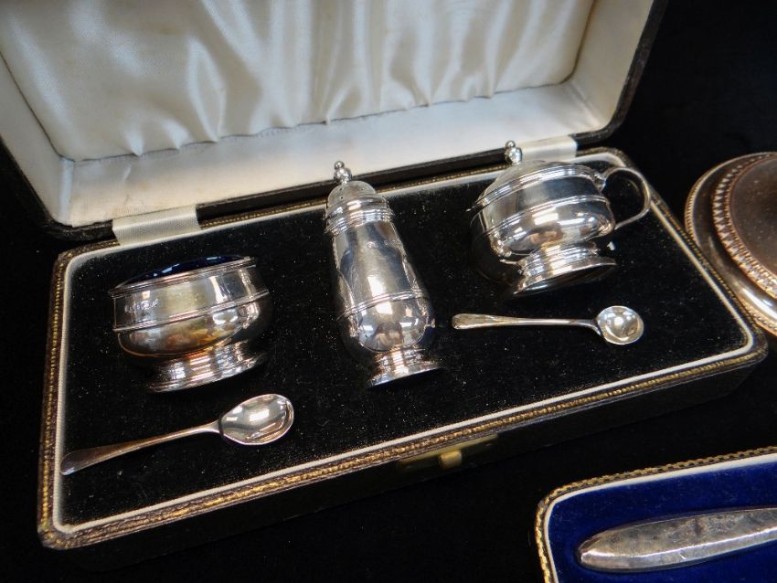 PAIR OLD SHEFFIELD PLATE TABLE CANDLESTICKS & BOXED TABLEWARES, the candlesticks of near classical form with beaded rims, 24.5cms high (loaded bases), boxed three piece cruet, boxed George V three piece cruet by Thomas Bradbury & Sons, 3.4ozt, and boxed set of George VI silver handled fruit knives by William Suckling Limited (4)