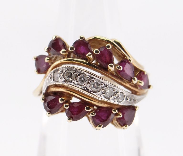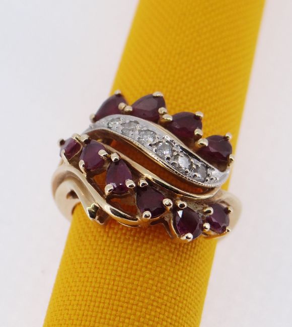 14K GOLD RUBY & DIAMOND TRIPLE ROW RING, ring size L / M, 6.3gms