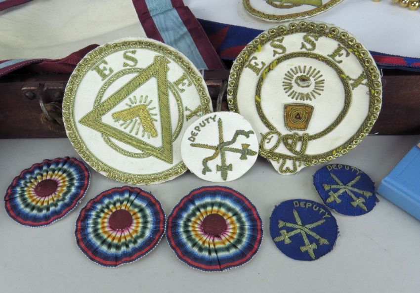 MASONIC MEMORABILIA, including Essex Grand Overseer jewel, Essex Grand Chapter Deputy Sword Bearers jewel, Principle Grand Soujourner jewel, Grand Standard Bearer jewel, Jewel of the Order, numerous gilt metal and enamel R.M.I. Boys/ Girls etc. badges, plated presentation set square badge with inscription, Essex Royal Arch Companions apron and sash, maroon/turquoise trimmed apron, two collar badges one suspending Assistant Grand Director of Ceremonies jewel, various Essex chapter embroidered dress badges, two lecture transcripts, various printed documents, pamphlets relating to Royal Masonic Institution for Girls, Holy Royal Arch ceremony booklets, Constitutions & Regulations book, in wooden baize lined case, all circa 1950s to '70s