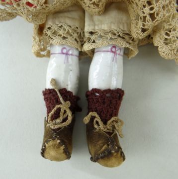 LATE 19TH CENTURY GERMAN CHINA SHOULDER-HEAD DOLL, with china lower limbs, cloth body, painted facial features and hair, wearing white cotton underwear, red smock dress lace collar, leather boots, 29.5cms high