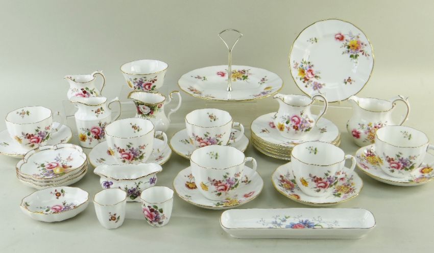 ASSORTED ROYAL CROWN DERBY 'DERBY POSIES' BONE CHINA, including cups, saucers, jugs, tea plate, and a few other bone china patterns by other factories (32)