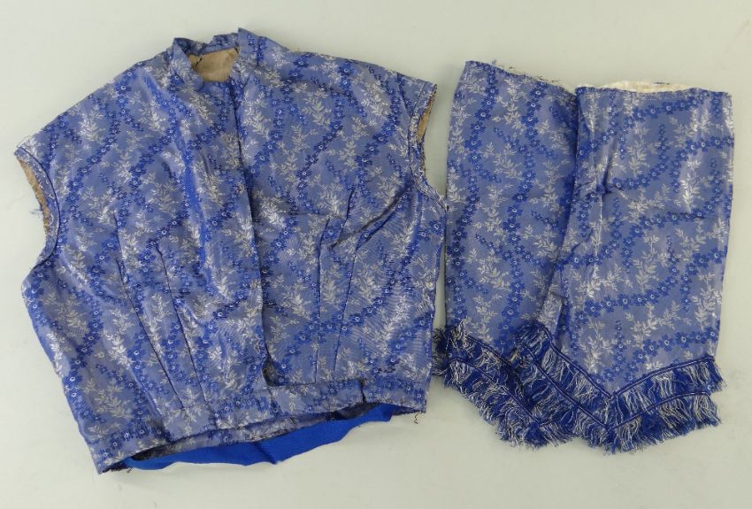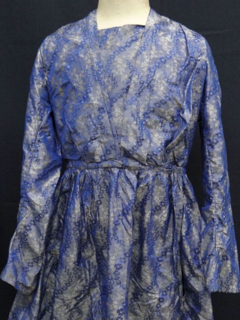 VICTORIAN BLUE SILK DAY DRESS, the separate bodice with stays, unstitched sleeves with double v-shaped fringes to the cuffs, 125cm h (2)The dress does look small.The total length is roughly 128cm’s. The waist, just across the front is 30 cm’s.The length of arm from shoulder to cuff is 52cm’s