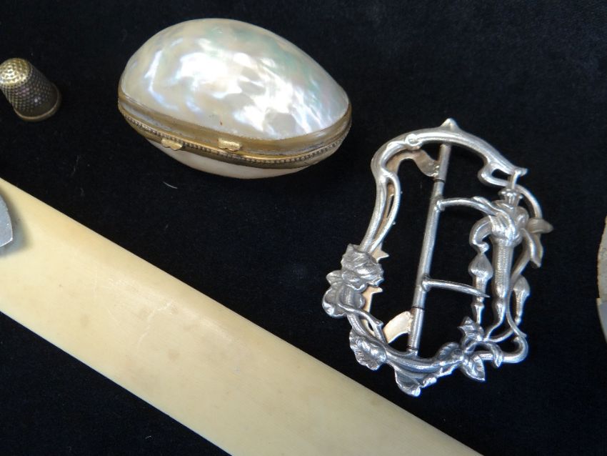 GROUP OF SILVER OR PLATED COLLECTIBLES, including three mesh purses, one 800 standard, Continental silver floral belt buckle, silver mounted tortoiseshell spectacle case, Georgian paste-set shoe buckle, silver Celtic sword ornament, otter paw mounted cellulose page turner, Palais Royale type shell box and mother of pearl and abalone oval case (missing some segments)