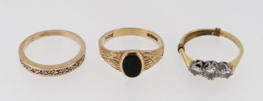 THREE GOLD RINGS comprising 18ct gold three stone diamond ring, gold diamond chip half eternity ring and 9ct gold bloodstone ring, 7.0gms overall (3)
