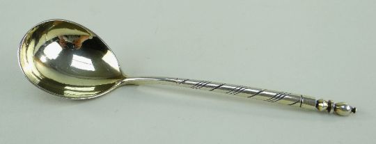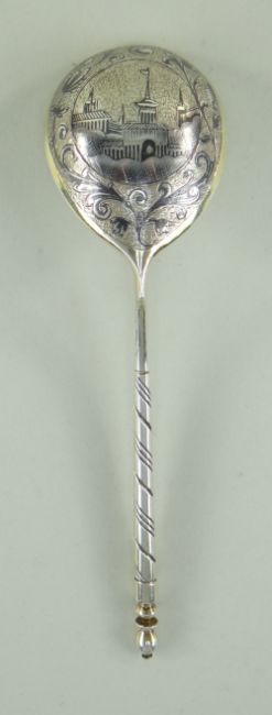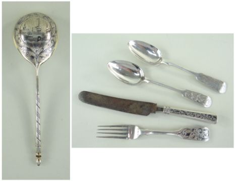 Condition: knife handle separated from blade which is corroded, rococo spoon stem repaired and slightly worn decoration and bowl, fork tines slightly bent tips, gilding worn to Russian silver gilt spoon, especially the handle.