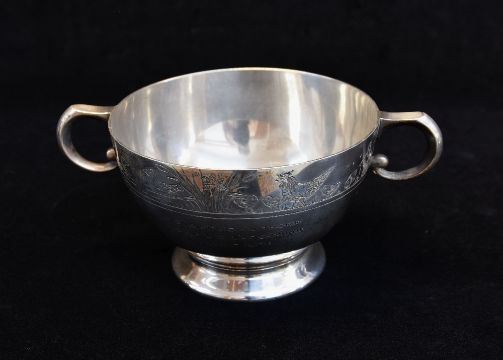 GEORGE V SILVER CHRISTENING CUP, London 1928 by Mappin & Webb, twin handles with engraved border of chickens, ducks, flowers and farm, engraved inscription dated 1929, 15cms wide, appr. wt. 6 ozt